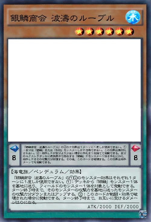 | 「銀鱗商会 波濤のルーブル」の②のP効果は1ターンに1度しか使用できない。①:自分は「銀鱗」または「永劫」モンスターしかP召喚できない。この効果は無効化されない。②:相手LPが自分より少ない場合に手札を1枚捨てて発動できる。自分のエクストラデッキに表側表示で存在する「銀鱗」Pモンスター1体を手札に加え、相手LPをその攻撃力分回復する。その後、このカードを破壊する。この効果は相手ターンでも発動できる。 | |||