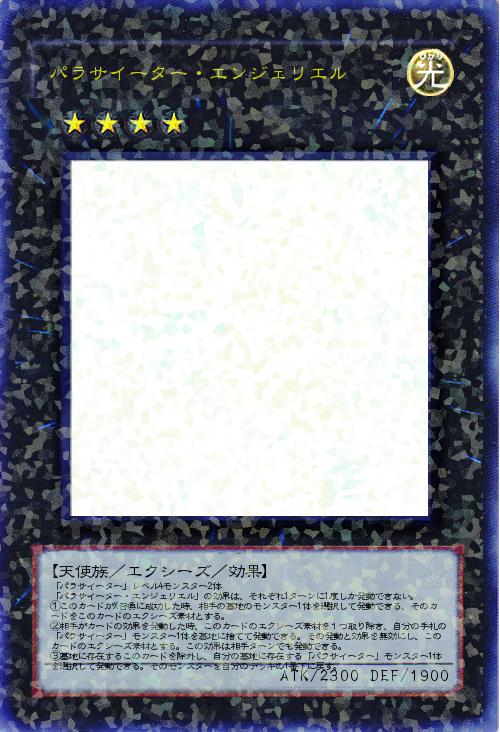 | 「パラサイーター」レベル4モンスター2体 「パラサイーター・エンジェリエル」の効果は、それぞれ1ターンに1度しか発動できない。 ①このカードがX召喚に成功した時、相手の墓地のモンスター1体を選択して発動できる、そのカードをこのカードのエクシーズ素材とする。 ②相手がカードの効果を発動した時、このカードのエクシーズ素材を1つ取り除き、自分の手札の「パラサイーター」モンスター1体を墓地に捨てて発動できる。その発動と効果を無効にし、このカードのエクシーズ素材とする。この効果は相手ターンでも発動できる。 ③墓地に存在するこのカードを除外し、自分の墓地に存在する「パラサイーター」モンスター1体を選択して発動できる。そのモンスターを自分のデッキの1番下に戻す。 | |||