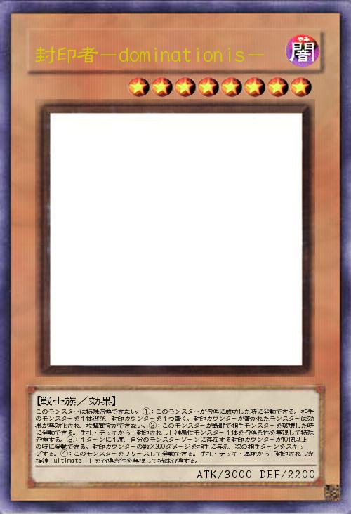 | このモンスターは特殊召喚できない。①:このモンスターが召喚に成功した時に発動できる。相手のモンスターを1体選び、封印カウンターを1つ置く。封印カウンターが置かれたモンスターは効果が無効化され、攻撃宣言ができない。②:このモンスターが戦闘で相手モンスターを破壊した時に発動できる。手札・デッキから「封印されし」神属性モンスター1体を召喚条件を無視して特殊召喚する。③:1ターンに1度、自分のモンスターゾーンに存在する封印カウンターが10個以上の時に発動できる。封印カウンターの数×300ダメージを相手に与え、次の相手ターンをスキップする。④:このモンスターをリリースして発動できる。手札・デッキ・墓地から「封印されし究極神-ultimate-」を召喚条件を無視して特殊召喚する。 | |||