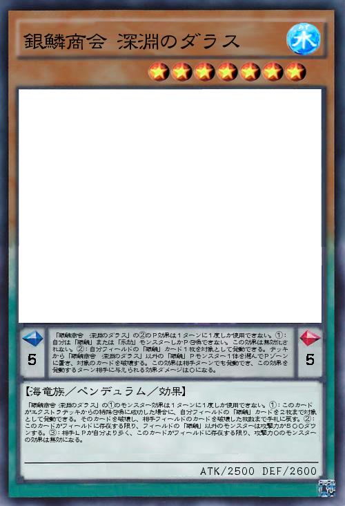 | 「銀鱗商会 深淵のダラス」の②のP効果は1ターンに1度しか使用できない。①:自分は「銀鱗」または「永劫」モンスターしかP召喚できない。この効果は無効化されない。②:自分フィールドの「銀鱗」カード1枚を対象として発動できる。デッキから「銀鱗商会 深淵のダラス」以外の「銀鱗」Pモンスター1体を選んでPゾーンに置き、対象のカードを破壊する。この効果は相手ターンでも発動でき、この効果を発動するターン相手に与えられる効果ダメージは0になる。 | |||