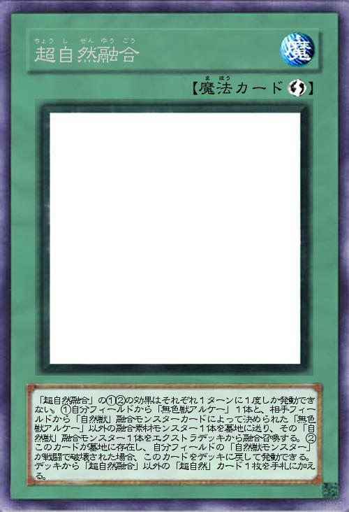 | 「超自然融合」の①②の効果はそれぞれ1ターンに1度しか発動できない。①自分フィールドから「無色獣アルケー」1体と、相手フィールドから「自然獣」融合モンスターカードによって決められた「無色獣アルケー」以外の融合素材モンスター1体を墓地に送り、その「自然獣」融合モンスター1体をエクストラデッキから融合召喚する。②このカードが墓地に存在し、自分フィールドの「自然獣モンスター」が戦闘で破壊された場合、このカードをデッキに戻して発動できる。デッキから「超自然融合」以外の「超自然」カード1枚を手札に加える。 | |||