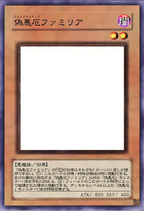 | 「偽悪厄ファミリア」の①②の効果はそれぞれ1ターンに1度しか使用できない。①:このカードの召喚・特殊召喚成功時に発動できる。自分の墓地に存在する「偽悪厄ファミリア」以外の「偽悪厄」モンスター1体を手札に加える。②:フィールドのこのカードが相手によって破壊された場合に発動できる。デッキからレベル5以上の「偽悪厄」モンスター1体を特殊召喚する。 | |||