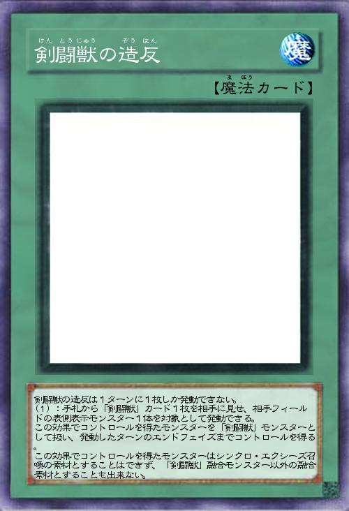 | 剣闘獣の造反は1ターンに1枚しか発動できない。 (1):手札から「剣闘獣」カード1枚を相手に見せ、相手フィールドの表側表示モンスター1体を対象として発動できる。 この効果でコントロールを得たモンスターを「剣闘獣」モンスターとして扱い、発動したターンのエンドフェイズまでコントロールを得る。 この効果でコントロールを得たモンスターはシンクロ・エクシーズ召喚の素材とすることはできず、「剣闘獣」融合モンスター以外の融合素材とすることも出来ない。 | |||
