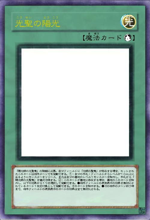 | 「陽光眼の光聖竜」の降臨に必要。自分フィールドに「光眼の聖竜」が存在する場合、セットされたこのカードは相手ターンでも発動できる。①:自分の手札・フィールドからレベルが10以上になるようにモンスターをリリース、または自分の墓地のレベル1モンスターを除外し、手札から「陽光眼の光聖竜」を儀式召喚する。②:このカードが墓地に存在する場合、墓地のこのカードを除外し、以下の効果から1つを選択して発動できる。●相手フィールドの表側表示の効果を無効にされているカード1枚を対象として発動できる。そのカードを除外する。●次の相手のターン終了時まで、相手フィールドの表側表示のカードの効果は全て無効化される。 | |||