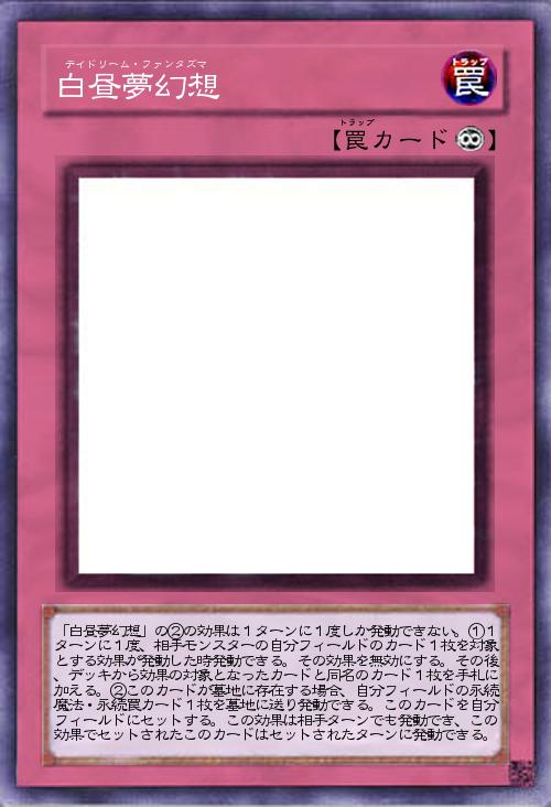 | 「白昼夢幻想」の②の効果は1ターンに1度しか発動できない。①1ターンに1度、相手モンスターの自分フィールドのカード1枚を対象とする効果が発動した時発動できる。その効果を無効にする。その後、デッキから効果の対象となったカードと同名のカード1枚を手札に加える。②このカードが墓地に存在する場合、自分フィールドの永続魔法・永続罠カード1枚を墓地に送り発動できる。このカードを自分フィールドにセットする。この効果は相手ターンでも発動でき、この効果でセットされたこのカードはセットされたターンに発動できる。 | |||