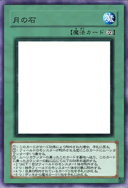 | ①:このカードがカード効果により除外された場合、手札に戻る。 ②:フィールドのモンスターが除外される度にこのカードにムーンカウンターを1つ乗せる。 ③:ムーンカウンターの乗ったこのカードを墓地へ送り、このカードに乗ったカウンターの数に応じて以下の効果を適用する。 ・2つ以下:自分フィールドのモンスター1体を除外する。 ・3つ:相手フィールドのモンスター1体を対象に除外する。 ・4つ:自身の除外されているカード2枚を手札に加える。 ・5つ:デッキから魔法カード1枚を手札に加える。 | |||