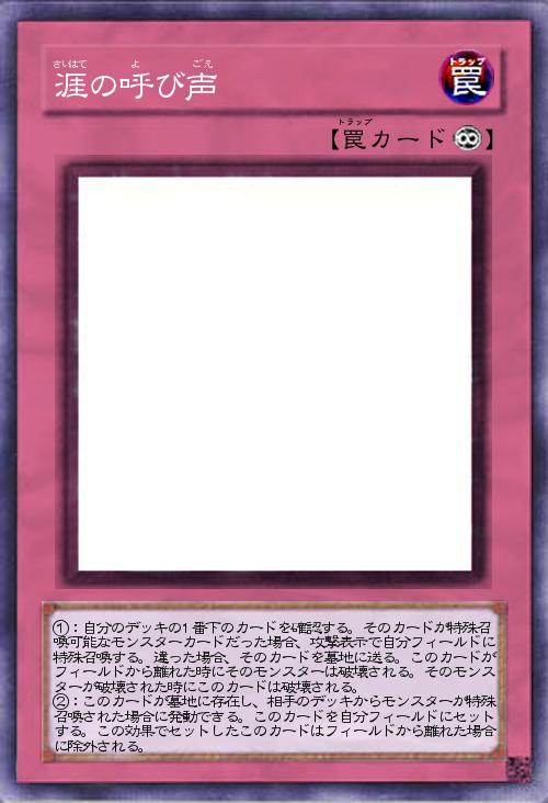 | ①:自分のデッキの1番下のカードを確認する。そのカードが特殊召喚可能なモンスターカードだった場合、攻撃表示で自分フィールドに特殊召喚する。違った場合、そのカードを墓地に送る。このカードがフィールドから離れた時にそのモンスターは破壊される。そのモンスターが破壊された時にこのカードは破壊される。 ②:このカードが墓地に存在し、相手のデッキからモンスターが特殊召喚された場合に発動できる。このカードを自分フィールドにセットする。この効果でセットしたこのカードはフィールドから離れた場合に除外される。 | |||