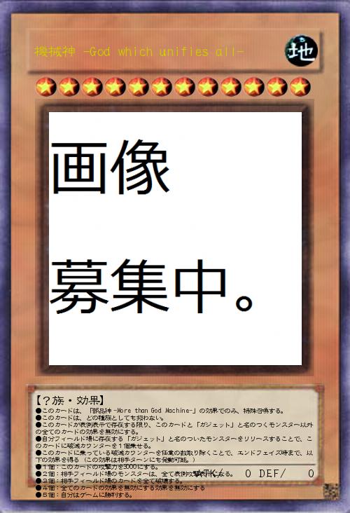 ●このカードは、「部品神 -More than God Machine-」の効果でのみ、特殊召喚する。 ●このカードは、どの種族としても扱わない。 ●このカードが表側表示で存在する限り、このカードと「ガジェット」と名のつくモンスター以外の全てのカードの効果を無効にする。 ●自分フィールド場に存在する「ガジェット」と名のついたモンスターをリリースすることで、このカードに破滅カウンターを1個乗せる。 ●このカードに乗っている破滅カウンターを任意の数取り除くことで、エンドフェイズ時まで、以下の効果を得る(この効果は相手ターンにも発動可能。) ●1個:このカードの攻撃力を3000にする。 ●2個:相手フィールド場のモンスターは、全て表側攻撃表示になる。 ●3個:相手フィールド場のカードを全て破壊する。 ●4個:全てのカードの効果を無効にする効果を無効にする ●5個:自分はゲームに勝利する。 |