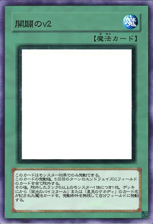 | このカードはモンスター効果でのみ発動できる。 このカードの発動後、5回目のターンのエンドフェイズにフィールドのカードを全て除外する。 その後、除外したランク6以上のモンスター1体につき1枚、デッキにから「栄光のバイコヌール」または「星見のケネディ」のカード名が記された魔法カードを、発動条件を無視して自分フィールドに発動する。 | |||