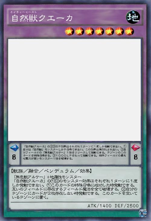 | 「自然獣クエーカ」の②③のP効果はそれぞれ1ターンに1度しか発動できない。①自分は「自然獣」モンスターしかP召喚できない。この効果は無効化されない。②自分フィールドの「無色獣アルケー」1体をリリースして発動できる。Pゾーンのこのカードを特殊召喚する。③1000LPを払って発動できる。相手フィールドの最も攻撃力が高いモンスター1体を破壊する。 | |||