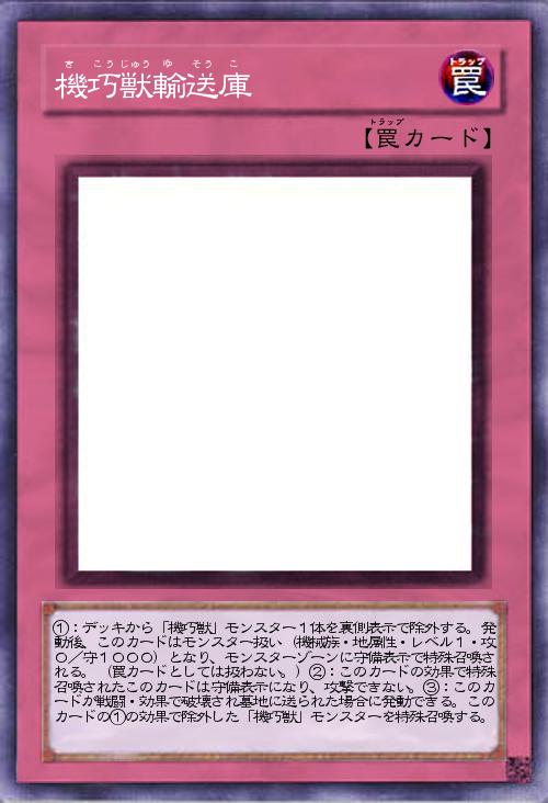 | ①:デッキから「機巧獣」モンスター1体を裏側表示で除外する。発動後、このカードはモンスター扱い(機械族・地属性・レベル1・攻0/守1000)となり、モンスターゾーンに守備表示で特殊召喚される。(罠カードとしては扱わない。)②:このカードの効果で特殊召喚されたこのカードは守備表示になり、攻撃できない。③:このカードが戦闘・効果で破壊され墓地に送られた場合に発動できる。このカードの①の効果で除外した「機巧獣」モンスターを特殊召喚する。 | |||