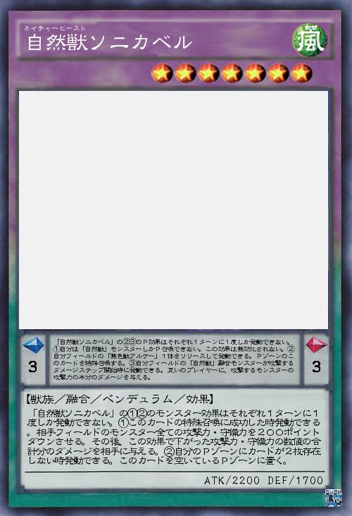 | 「自然獣ソニカベル」の②③のP効果はそれぞれ1ターンに1度しか発動できない。①自分は「自然獣」モンスターしかP召喚できない。この効果は無効化されない。②自分フィールドの「無色獣アルケー」1体をリリースして発動できる。Pゾーンのこのカードを特殊召喚する。③自分フィールドの「自然獣」融合モンスターが攻撃するダメージステップ開始時に発動できる。互いのプレイヤーに、攻撃するモンスターの攻撃力の半分のダメージを与える。 | |||