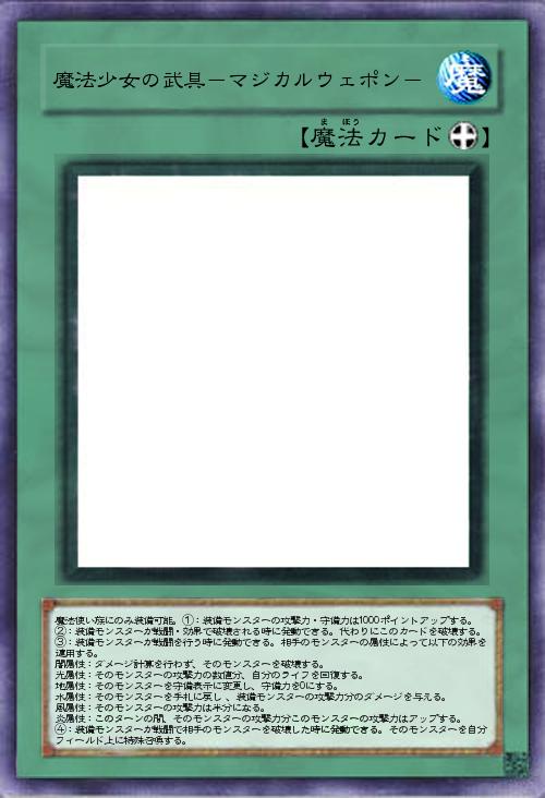「魔法少女といえば必ずと言っていいほど持っているのが魔法武器。なのでこのカードを投稿しました。魔法少女の武器なので魔法使い族以外装備できません。1番の効果は普通のパラメータ強化。2番の効果は破壊時に発動できる身代わり。3番の効果は相手の属性によって発動される6つの効果。4番はどういうわけか倒した相手が仲間になります。多分改心させたんでしょう。」(2017-02-01 19:22)