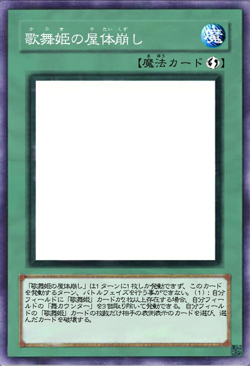 | 「歌舞姫の屋体崩し」は1ターンに1枚しか発動できず、このカードを発動するターン、バトルフェイズを行う事ができない。(1):自分フィールドに「歌舞姫」カードが2枚以上存在する場合、自分フィールドの「舞カウンター」を3個取り除いて発動できる。自分フィールドの「歌舞姫」カードの枚数だけ相手の表側表示のカードを選び、選んだカードを破壊する。 | |||