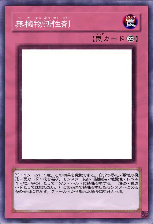 | ①:1ターンに1度、この効果を発動できる。自分の手札・墓地の魔法・罠カード1枚を選び、モンスター扱い(植物族・地属性・レベル1・攻/守0)として自分フィールドに特殊召喚する。(魔法・罠カードとしては扱わない。)この効果で特殊召喚したモンスターはX召喚の素材にできず、フィールドから離れた場合に除外される。 | |||