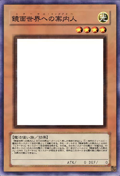 | 「鏡面世界への案内人」の①の効果は1ターンに1度しか使用できない。①:相手のフィールド・墓地のモンスター1体を対象として発動できる。手札・デッキから「鏡面世界への案内人」以外の「ミラーサル」モンスター1体を特殊召喚する。その後、そのモンスターの攻撃力・守備力は、対象のモンスターの元々の攻撃力・守備力と同じになる。②:自分フィールドに「鏡面世界への案内人」以外の「ミラーサル」モンスターが存在する限り、相手はこのカードを攻撃対象に選択できず、効果の対象にできない。 | |||