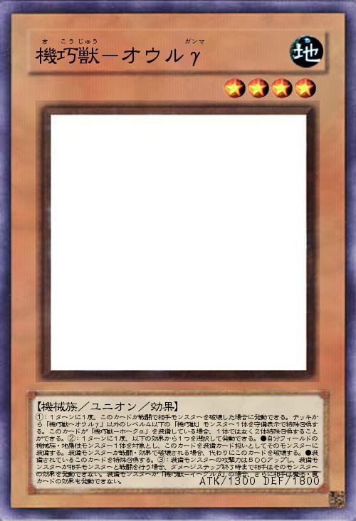 | ①:1ターンに1度、このカードが戦闘で相手モンスターを破壊した場合に発動できる。デッキから「機巧獣ーオウルγ」以外のレベル4以下の「機巧獣」モンスター1体を守備表示で特殊召喚する。このカードが「機巧獣-ホークα」を装備している場合、1体ではなく2体特殊召喚することができる。②:1ターンに1度、以下の効果から1つを選択して発動できる。●自分フィールドの機械族・地属性モンスター1体を対象とし、このカードを装備カード扱いとしてそのモンスターに装備する。装備モンスターが戦闘・効果で破壊される場合、代わりにこのカードを破壊する。●装備されているこのカードを特殊召喚する。③:装備モンスターの攻撃力は500アップし、装備モンスターが相手モンスターと戦闘を行う場合、ダメージステップ終了時まで相手はそのモンスターの効果を発動できない。装備モンスターが「機巧獣-イーグルβ」の場合、さらに相手は魔法・罠カードの | |||