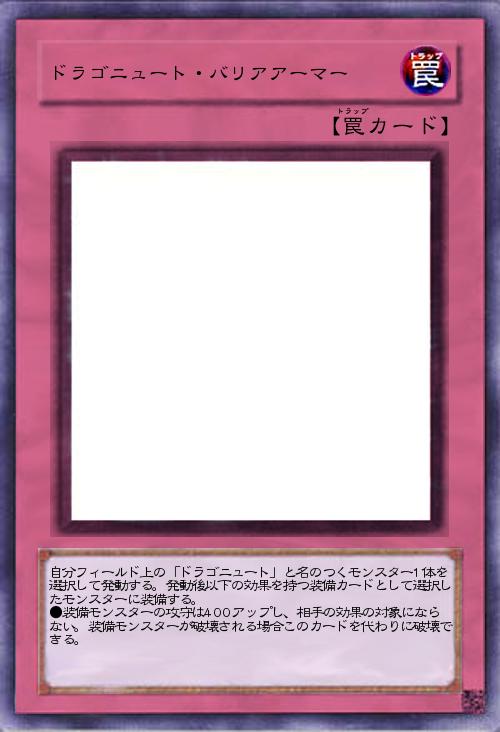 | 自分フィールド上の「ドラゴニュート」と名のつくモンスター1体を選択して発動する。発動後以下の効果を持つ装備カードとして選択したモンスターに装備する。 ●装備モンスターの攻守は400アップし、相手の効果の対象にならない。装備モンスターが破壊される場合このカードを代わりに破壊できる。 | |||