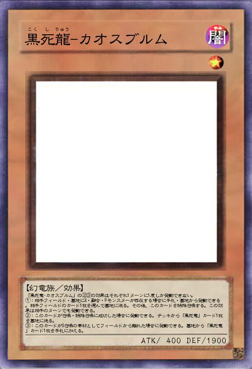 | 「黒死竜-カオスブルム」の②③の効果はそれぞれ1ターンに1度しか発動できない。 ①:相手フィールド・墓地にX・融合・Pモンスターが存在する場合に手札・墓地から発動できる。相手フィールドのカード1枚を選んで墓地に送る。その後、このカードを特殊召喚する。この効果は相手のターンでも発動できる。 ②:このカードが召喚・特殊召喚に成功した場合に発動できる。デッキから「黒死竜」カード1枚を墓地に送る。 ③:このカードがS召喚の素材としてフィールドから離れた場合に発動できる。墓地から「黒死竜」カード1枚を手札に加える。 | |||