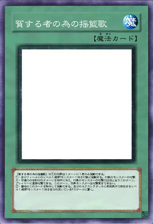 | 「貧する者の為の揺籃歌」の①の効果は1ターンに1度のみ発動できる。 ①:自分フィールドのレベル1通常Pモンスター1体を対象に発動する。対象のモンスターの攻撃力・守備力の合計分のダメージを相手に与え、対象のモンスターの攻撃力は倍となりこのターン、プレイヤーに直接攻撃できる。このターン、効果モンスターは攻撃宣言できない。 ②:墓地のこのカードを除外して発動できる。自分のエクストラデッキに表側表示で存在するレベル1通常Pモンスター1体を自分の空いているPスケールに置く。 | |||