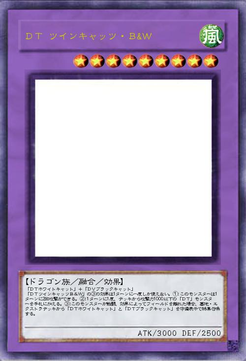 | 「DTホワイトキャット」+「DVブラックキャット」 「DTツインキャッツB&W」の③の効果は1ターンに一度しか使えない。①:このモンスターは1ターンに2回攻撃ができる。②:1ターンに1度、デッキから攻撃力1000以下の「DT」モンスターを手札に加える。③:このモンスターが戦闘、効果によってフィールドを離れた場合、墓地・エクストラデッキから「DTホワイトキャット」と「DTブラックキャット」を守備表示で特集召喚する。 | |||