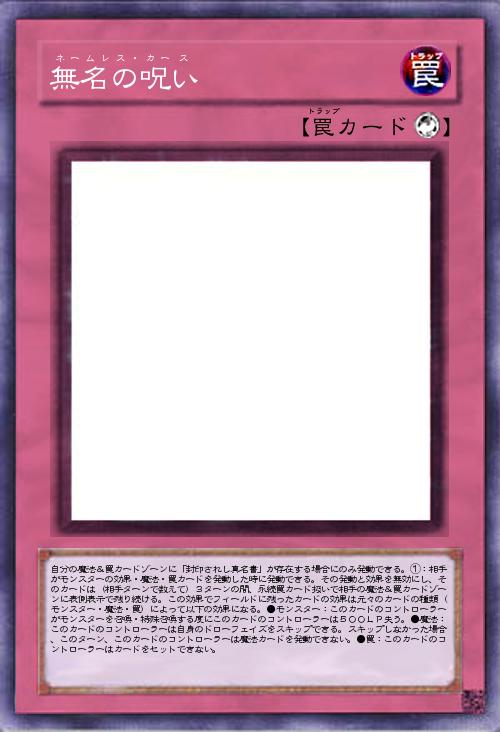 | 自分の魔法&罠カードゾーンに「封印されし真名書」が存在する場合にのみ発動できる。①:相手がモンスターの効果・魔法・罠カードを発動した時に発動できる。その発動と効果を無効にし、そのカードは(相手ターンで数えて)3ターンの間、永続罠カード扱いで相手の魔法&罠カードゾーンに表側表示で残り続ける。この効果でフィールドに残ったカードの効果は元々のカードの種類(モンスター・魔法・罠)によって以下の効果になる。●モンスター:このカードのコントローラーがモンスターを召喚・特殊召喚する度にこのカードのコントローラーは500LP失う。●魔法:このカードのコントローラーは自身のドローフェイズをスキップできる。スキップしなかった場合、このターン、このカードのコントローラーは魔法カードを発動できない。●罠:このカードのコントローラーはカードをセットできない。 | |||
