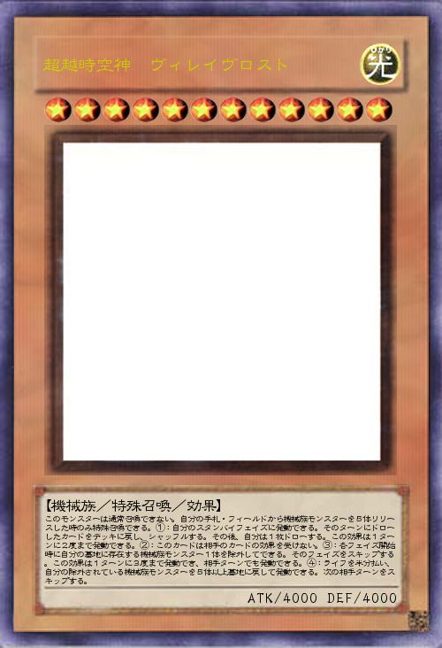 | このモンスターは通常召喚できない。自分の手札・フィールドから機械族モンスターを5体リリースした時のみ特殊召喚できる。①:自分のスタンバイフェイズに発動できる。そのターンにドローしたカードをデッキに戻し、シャッフルする。その後、自分は1枚ドローする。この効果は1ターンに2度まで発動できる。②:このカードは相手のカードの効果を受けない。③:各フェイズ開始時に自分の墓地に存在する機械族モンスター1体を除外してできる。そのフェイズをスキップする。この効果は1ターンに3度まで発動でき、相手ターンでも発動できる。④:ライフを半分払い、自分の除外されている機械族モンスターを5体以上墓地に戻して発動できる。次の相手ターンをスキップする。 | |||