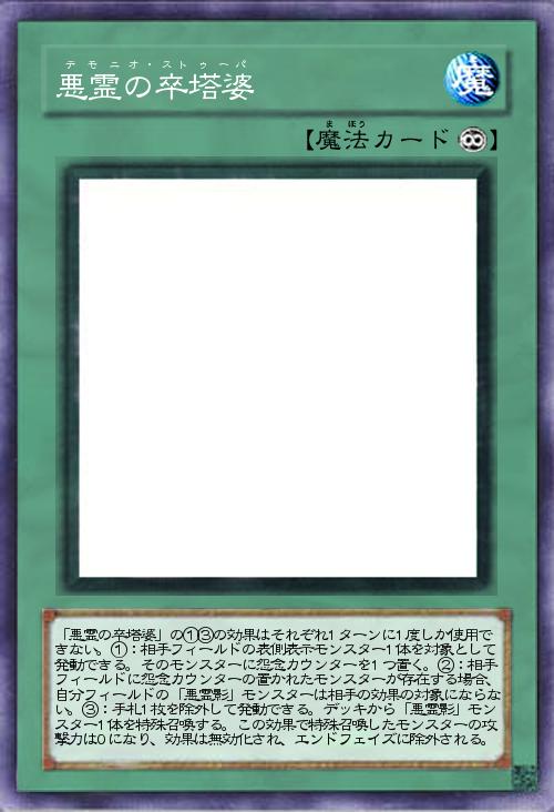 | 「悪霊の卒塔婆」の①③の効果はそれぞれ1ターンに1度しか使用できない。①:相手フィールドの表側表示モンスター1体を対象として発動できる。そのモンスターに怨念カウンターを1つ置く。②:相手フィールドに怨念カウンターの置かれたモンスターが存在する場合、自分フィールドの「悪霊影」モンスターは相手の効果の対象にならない。③:手札1枚を除外して発動できる。デッキから「悪霊影」モンスター1体を特殊召喚する。この効果で特殊召喚したモンスターの攻撃力は0になり、効果は無効化され、エンドフェイズに除外される。 | |||
