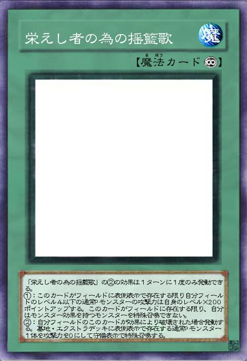 | 「栄えし者の為の揺籃歌」の②の効果は1ターンに1度のみ発動できる。 ①:このカードがフィールドに表側表示で存在する限り自分フィールドのレベル4以下の通常Pモンスターの攻撃力は自身のレベル×200ポイントアップする。このカードがフィールドに存在する限り、自分はモンスター効果を持つモンスターを特殊召喚できない。 ②:自分フィールドのこのカードが効果により破壊された場合発動する。墓地・エクストラデッキに表側表示で存在する通常Pモンスター1体を攻撃力を0にして守備表示で特殊召喚する。 | |||