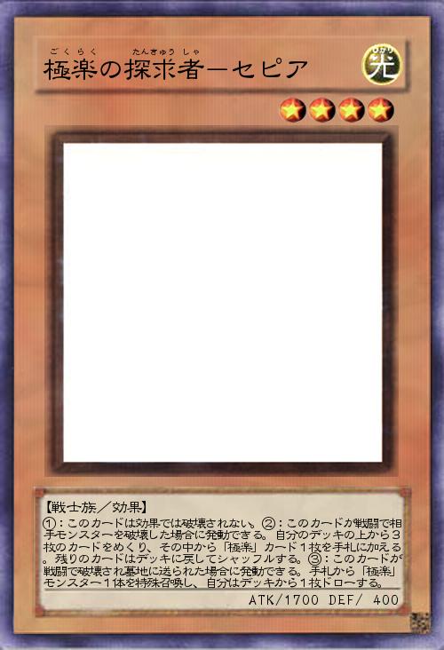 | ①:このカードは効果では破壊されない。②:このカードが戦闘で相手モンスターを破壊した場合に発動できる。自分のデッキの上から3枚のカードをめくり、その中から「極楽」カード1枚を手札に加える。残りのカードはデッキに戻してシャッフルする。③:このカードが戦闘で破壊され墓地に送られた場合に発動できる。手札から「極楽」モンスター1体を特殊召喚し、自分はデッキから1枚ドローする。 | |||