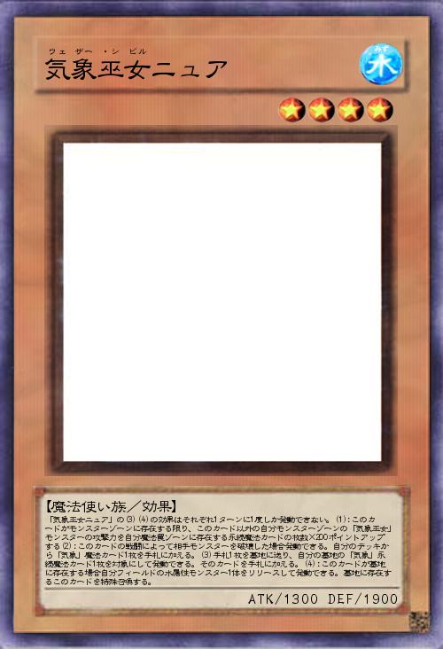 | 「気象巫女ニュア」の(3)(4)の効果はそれぞれ1ターンに1度しか発動できない。(1):このカードがモンスターゾーンに存在する限り、このカード以外の自分モンスターゾーンの「気象巫女」モンスターの攻撃力を自分魔法罠ゾーンに存在する永続魔法カードの枚数×200ポイントアップする(2):このカードの戦闘によって相手モンスターを破壊した場合発動できる。自分のデッキから「気象」魔法カード1枚を手札に加える。(3)手札1枚を墓地に送り、自分の墓地の「気象」永続魔法カード1枚を対象にして発動できる。そのカードを手札に加える。(4):このカードが墓地に存在する場合自分フィールドの水属性モンスター1体をリリースして発動できる。墓地に存在するこのカードを特殊召喚する。 | |||