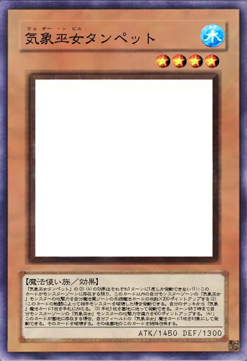 | 「気象巫女タンペット」の(3)(4)の効果はそれぞれ1ターンに1度しか発動できない(1):このカードがモンスターゾーンに存在する限り、このカード以外の自分モンスターゾーンの「気象巫女」モンスターの攻撃力を自分魔法罠ゾーンの永続魔法カードの枚数×200ポイントアップする(2):このカードの戦闘によって相手モンスターを破壊した場合発動できる。自分のデッキから「気象」魔法カード1枚を手札に加える。(3)手札1枚を墓地に送って発動できる。ターン終了時まで自分モンスターゾーンの「気象巫女」モンスターの攻撃力守備力を400ポイントアップする。(4);このカードが墓地に存在する場合、自分フィールドの「気象巫女」魔法カード1枚を対象にして発動できる。そのカードを破壊する。その後墓地のこのカードを特殊召喚する。 | |||
