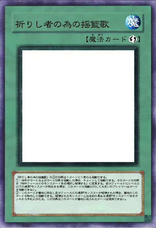 | 「祈りし者の為の揺籃歌」の②の効果は1ターンに1度のみ発動できる。 ①:相手がカードおよびカード効果を発動した場合、チェーンして発動できる。そのカードの効果を「相手フィールドのモンスター1体を選択し破壊する」に変更する。自分フィールドにレベル2以下の通常Pモンスターが存在する場合、このカードの発動に対してお互いのプレイヤーはカードを発動できない。 ②:このカードが墓地に存在し自分フィールドの通常Pモンスターが破壊された場合、墓地のこのカードを除外して発動できる。破壊されたモンスターとは名前の異なる通常Pモンスター1体をデッキから手札に加える。この効果はこのカードが墓地に送られたターンは使用できない。 | |||