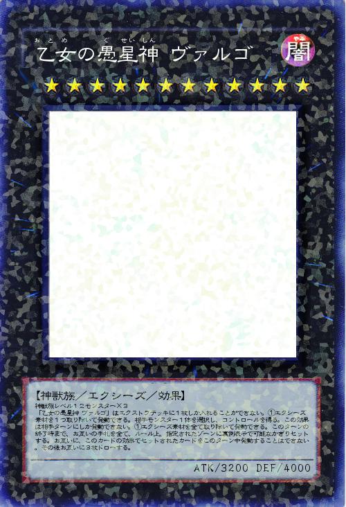 | 神獣族レベル12モンスター×3 「乙女の愚星神 ヴァルゴ」はエクストラデッキに1枚しか入れることができない。①エクシーズ素材を1つ取り除いて発動できる。相手モンスター1体を選択し、コントロールを得る。この効果は相手ターンにしか発動できない。①エクシーズ素材を全て取り除いて発動できる。このターンの終了時まで、お互いの手札を全て、ルール上、指定されたゾーンに裏側表示で可能なかぎりセットする。お互いに、このカードの効果でセットされたカードをこのターン中発動することはできない。その後お互いに3枚ドローする。 | |||