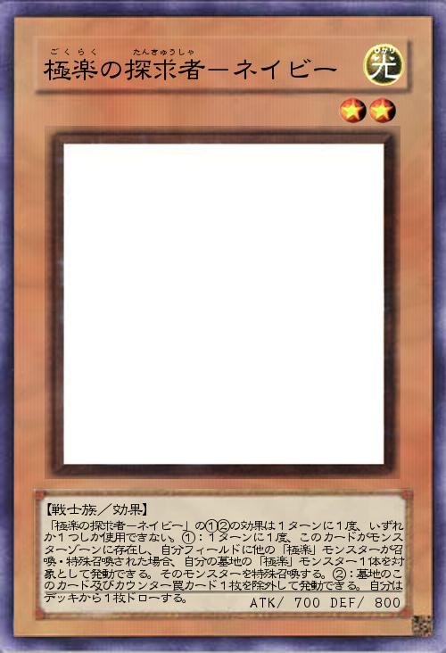 | 「極楽の探求者-ネイビー」の①②の効果は1ターンに1度、いずれか1つしか使用できない。①:1ターンに1度、このカードがモンスターゾーンに存在し、自分フィールドに他の「極楽」モンスターが召喚・特殊召喚された場合、自分の墓地の「極楽」モンスター1体を対象として発動できる。そのモンスターを特殊召喚する。②:墓地のこのカード及びカウンター罠カード1枚を除外して発動できる。自分はデッキから1枚ドローする。 | |||