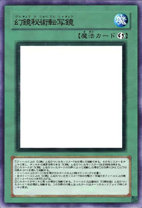 | ①フィールド上の「幻鏡」と名のついたモンスター1枚を選んで発動できる。そのモンスターをデッキに戻し、デッキから通常召喚できる「幻鏡」と名のついたモンスター1枚を特殊召喚する。 ②このカードが「幻鏡」と名のついたカードの効果によって発動した場合①の効果に加えて以下の効果から1つを選んで発動する。 ・フィールド上のカード1枚を選びそのカードの上に鏡カウンター3つを置く ・自分フィールド上の「幻鏡」と名のついたモンスター1体の攻撃力・守備力をフィールド上の鏡カウンター1つにつき300上げる。 ③このカードがデッキに戻った場合に発動できる。フィールド又は墓地の「幻鏡秘術」と名のついたカード1枚を選択し発動する。この効果の対象となったカードはターンのエンドフェイズ時にデッキに戻す。 | |||