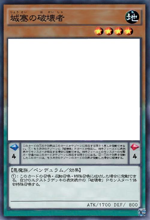 | このカードの①のP効果はこのカードがPゾーンに存在する限り1度しか発動できない。①:もう片方のPゾーンに「破壊者」Pカードが存在し、相手フィールドに表側表示でモンスターが存在する場合に発動できる。相手フィールドのモンスターの攻撃力・守備力はこのカードがPゾーンに存在する限り0になる。②:①のP効果を発動したこのカードは、もう片方のPゾーンのカードの効果が発動した場合に破壊する。 | |||