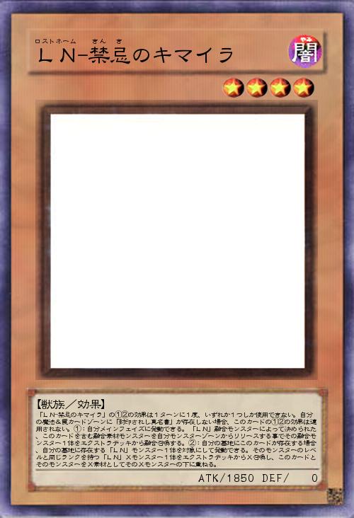 | 「LN-禁忌のキマイラ」の①②の効果は1ターンに1度、いずれか1つしか使用できない。自分の魔法&罠カードゾーンに「封印されし真名書」が存在しない場合、このカードの①②の効果は適用されない。①:自分メインフェイズに発動できる。「LN」融合モンスターによって決められた、このカードを含む融合素材モンスターを自分モンスターゾーンからリリースする事でその融合モンスター1体をエクストラデッキから融合召喚する。②:自分の墓地にこのカードが存在する場合、自分の墓地に存在する「LN」モンスター1体を対象にして発動できる。そのモンスターのレベルと同じランクを持つ「LN」Xモンスター1体をエクストラデッキからX召喚し、このカードとそのモンスターをX素材としてそのXモンスターの下に重ねる。 | |||