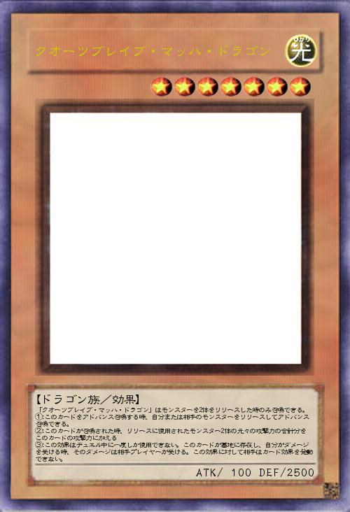 | 「クオーツブレイブ・マッハ・ドラゴン」はモンスターを2体をリリースした時のみ召喚できる。 ①:このカードをアドバンス召喚する時、自分または相手のモンスターをリリースしてアドバンス召喚できる。 ②:このカードが召喚された時、リリースに使用されたモンスター2体の元々の攻撃力の合計分をこのカードの攻撃力に加える ③:この効果はデュエル中に一度しか使用できない。このカードが墓地に存在し、自分がダメージを受ける時、そのダメージは相手プレイヤーが受ける。この効果に対して相手はカード効果を発動できない。 | |||
