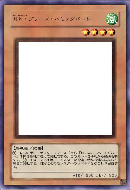 | ①:自分の手札・デッキ・フィールドから「N・エア・ハミングバード」1体を墓地に送って発動できる。このカードを手札から特殊召喚する。②:1ターンに1度、モンスターが召喚・特殊召喚に成功した場合に発動する。自分はそのモンスターのレベル×300LP回復する。 | |||