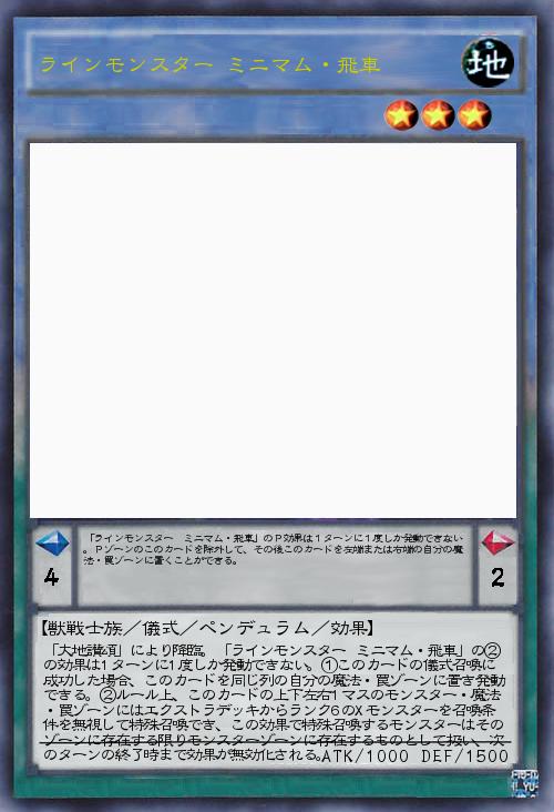 | 「ラインモンスター ミニマム・飛車」のP効果は1ターンに1度しか発動できない。Pゾーンのこのカードを除外して、その後このカードを左端または右端の自分の魔法・罠ゾーンに置くことができる。 | |||