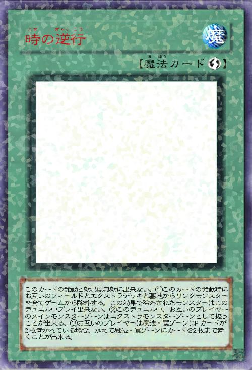 発動時に全エリアからリンクモンスターを除外し、この効果で除外されたカードはデュエル中使用不可になる。同時に擬似的にルールをマスタールール3に戻す、故に『時の逆行』。お互いに効果があるので一方的な利益にはならないが、発動を止めることは不可能。ルール破壊系効果にありがちな場に残るカードでもないので、後から効果を消すのも不可能。