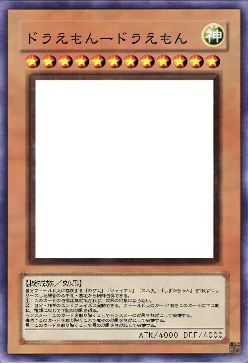 | 自分フィールド上に存在する「のび太」「ジャイアン」「スネ夫」「しずかちゃん」を1枚ずつリリースした場合のみ手札・墓地から特殊召喚できる。 ①:このカードの召喚は無効化されず、効果の対象にならない。 ②:自分・相手のエンドフェイズに発動できる。フィールド上のカード1枚をこのカードの下に重ね、種類に応じて下記の効果を得る。 モンスター:このカードを取り除くことでモンスターの効果を無効にして破壊する。 魔法:このカードを取り除くことで魔法の効果を無効にして破壊する。 罠:このカードを取り除くことで罠の効果を無効にして破壊する。 | |||