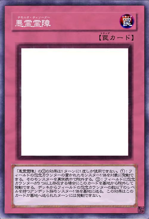 | 「悪霊霊障」の②の効果は1ターンに1度しか使用できない。①:フィールドの怨念カウンターの置かれたモンスター1体を対象に発動できる。そのモンスターを裏側表示で除外する。②:フィールドに怨念カウンターが3つ以上存在する場合にこのカードを墓地から除外して発動できる。デッキからフィールドの怨念カウンターの数以下のレベルを持つアンデット族モンスター1体を墓地に送る。この効果はこのカードが墓地へ送られたターンには発動できない。 | |||