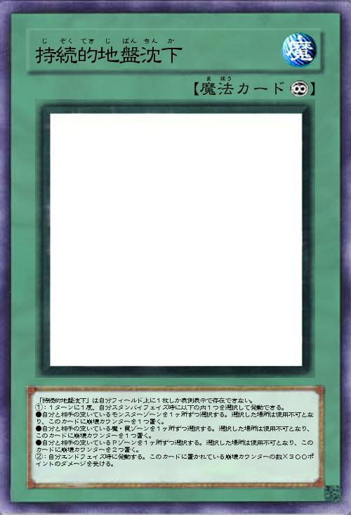 | 「持続的地盤沈下」は自分フィールド上に1枚しか表側表示で存在できない。 ①:1ターンに1度、自分スタンバイフェイズ時に以下の内1つを選択して発動できる。 ●自分と相手の空いているモンスターゾーンを1ヶ所ずつ選択する。選択した場所は使用不可となり、このカードに崩壊カウンターを1つ置く。 ●自分と相手の空いている魔・罠ゾーンを1ヶ所ずつ選択する。選択した場所は使用不可となり、このカードに崩壊カウンターを1つ置く。 ●自分と相手の空いているPゾーンを1ヶ所ずつ選択する。選択した場所は使用不可となり、このカードに崩壊カウンターを2つ置く。 ②:自分エンドフェイズ時に発動する。このカードに置かれている崩壊カウンターの数×300ポイントのダメージを受ける。 | |||