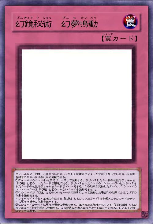 | フィールドに「幻鏡」と名のついたカードもしくは鏡カウンターが3つ以上乗っているカードがある場合このカードは手札から発動できる。 ①フィールドのカードを2枚までリリースして発動する。リリースしたカードの枚数分デッキから「幻鏡」と名のついたカードを墓地に送る。リリースされたカードのコントローラーはリリースされたカードの枚数分デッキからカードをドローできる。この効果が発動したターン、このカードのコントローラーは「幻鏡」と名のつかないカードを発動できない。 ②このカードが「幻鏡」と名のついたカードの効果によって発動した場合①の効果に加えて以下の効果を発動できる。 ・フィールド・手札・墓地に存在する「幻鏡」と名のついたカード1枚を選択しそのカードがデッキに戻った場合の効果を適用する。 ③このカードがデッキに戻った場合に発動できる。墓地または除外されている「幻鏡秘術」と名のついたカード1枚を選択し発動 | |||