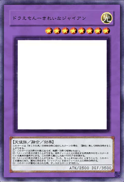 | このカードは「きこりの泉」の特殊召喚に成功したターンの場合、「融合」無しで特殊召喚することができる。 ①:このカードは効果の対象にならず、戦闘・効果で破壊されない。 ②:1ターンに1度だけ使うことができる。相手フィールド上に存在する表側表示のモンスターカードを裏側守備表示にする。この効果で裏にした数×1000LPを回復する。 ③:1ターンに1度だけ使うことができる。「いえ、もっときたないの」と言うことで、このカードを墓地に送り、墓地に存在する「ジャイアン」を自分フィールド上に特殊召喚する。 ④:このカードが墓地に送られた時、デッキからカードを1枚引く。 | |||