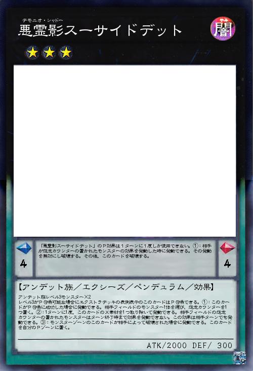 | 「悪霊影スーサイドデット」のP効果は1ターンに1度しか使用できない。①:相手が怨念カウンターの置かれたモンスターの効果を発動した時に発動できる。その発動を無効にし破壊する。その後、このカードを破壊する。 | |||