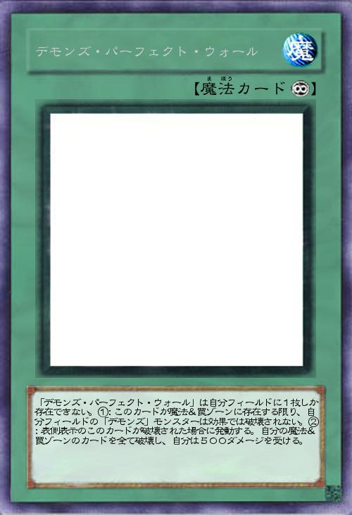 | 「デモンズ・パーフェクト・ウォール」は自分フィールドに1枚しか存在できない。①:このカードが魔法&罠ゾーンに存在する限り、自分フィールドの「デモンズ」モンスターは効果では破壊されない。②:表側表示のこのカードが破壊された場合に発動する。自分の魔法&罠ゾーンのカードを全て破壊し、自分は500ダメージを受ける。 | |||