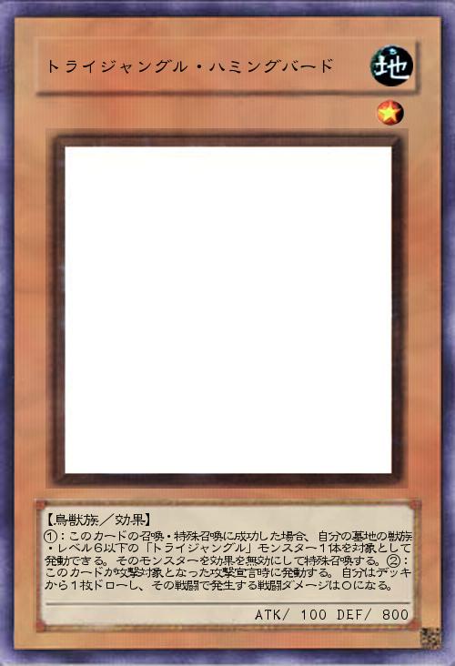 | ①:このカードの召喚・特殊召喚に成功した場合、自分の墓地の獣族・レベル6以下の「トライジャングル」モンスター1体を対象として発動できる。そのモンスターを効果を無効にして特殊召喚する。②:このカードが攻撃対象となった攻撃宣言時に発動する。自分はデッキから1枚ドローし、その戦闘で発生する戦闘ダメージは0になる。 | |||